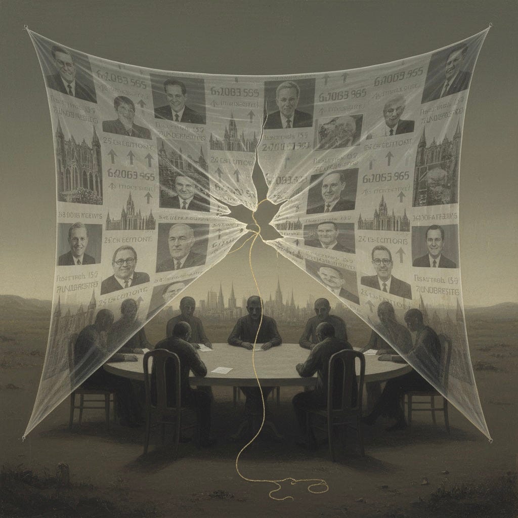 This is how networks unravel. They are resilient until they are not. They can absorb damage, sacrifice peripheral members, maintain coherence through selective pruning. But beyond a certain threshold, exposure becomes cascading. The mutual blackmail that held the network together becomes mutual visibility. The documentation that ensured loyalty finally delivers on its promise of mutually-assured destruction.